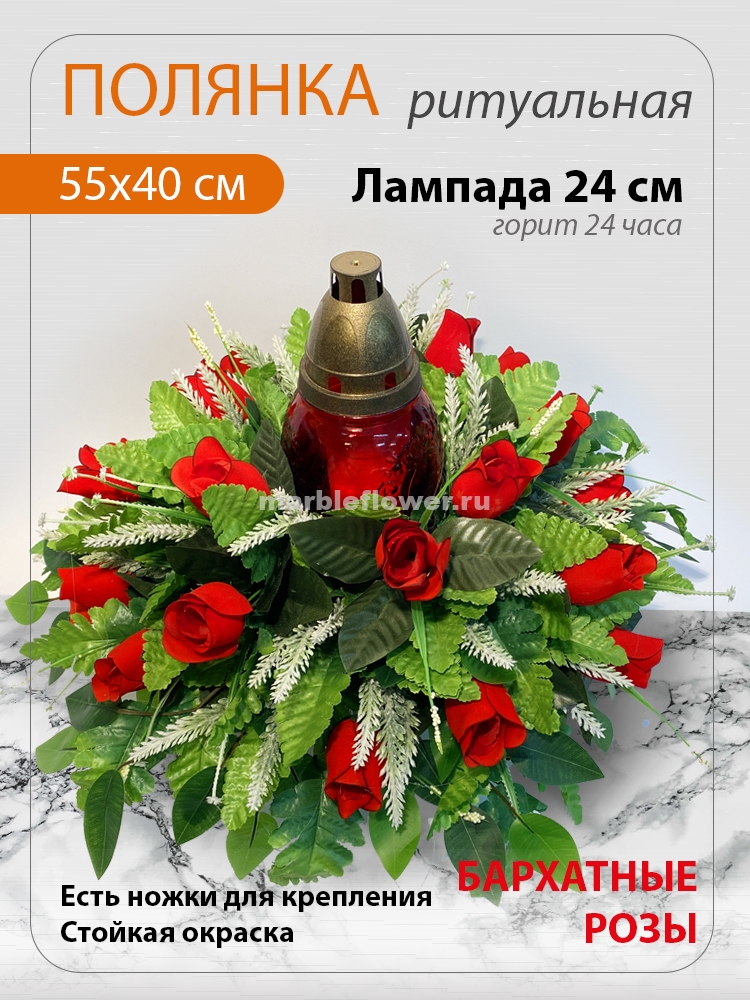 Полянка изысканно украсит место захоронения и может быть установлена в любое время (в отличие от венка, который устанавливают обычно только во время похорон).